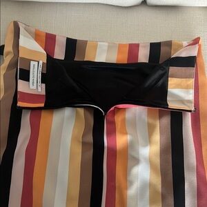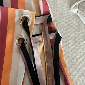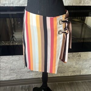 Orange cream black mustard tan striped skirt faux wrap with ties. Once flap is tied, this has a slight assymetrical look