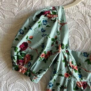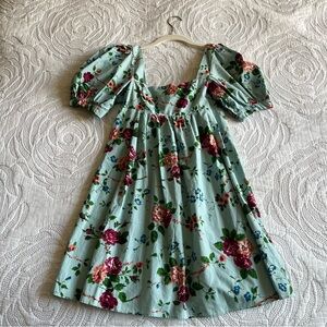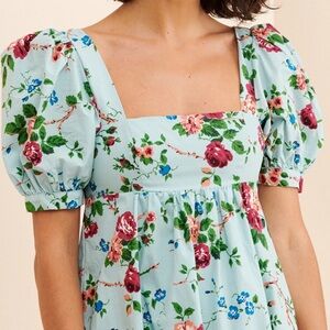 Keywords: Floral babydoll dress, Vintage-inspired mini dress, Puff sleeve dress, Cottagecore fashion, Summer floral dress, Romantic style dress, Square neckline dress, Light blue floral dress, Urban Outfitters collaboration, Laura Ashley dress