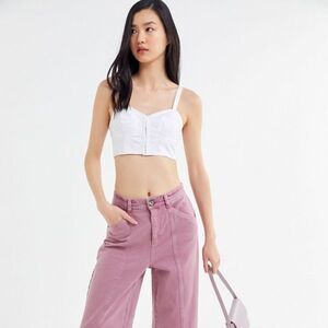 Bustier-style cropped top by UO in a seam-paneled cotton cut slim with a front hook + eye closure. Finished with skinny shoulder straps at the v-neckline + cut short with a cropped hem. Find it only at Urban Outfitters.