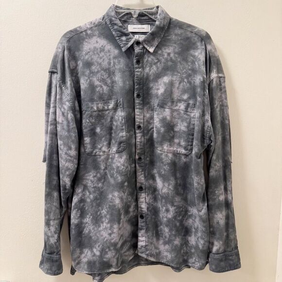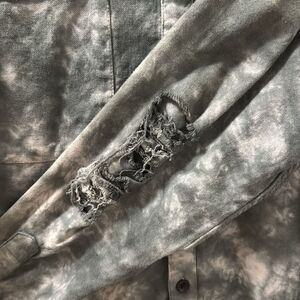 Urban Outfitters men’s long-sleeve button-down shirt in a gray and black tie-dye wash. Features two chest pockets, full button front, and raw distressed detailing on the sleeves for a lived-in, vintage-inspired look. Soft, mid-weight fabric—perfect for layering or wearing on its own.
