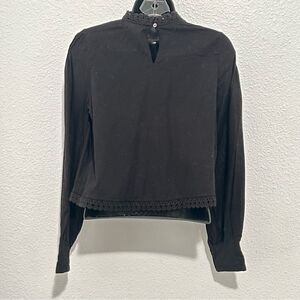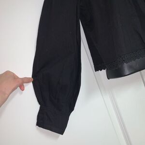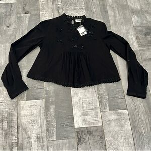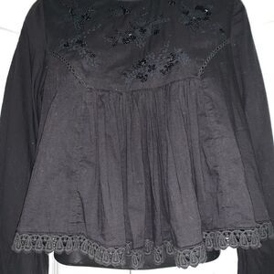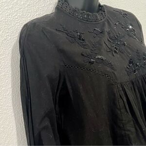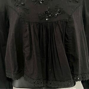 Urban Outfitters Boho Black Beaded Sequin Embroidered Eyelet Moc Neck Gathered Bib Puff Sleeve Crop Cotton