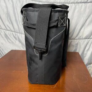 Measures 12"H x 15"W x 7"D. Has a shoulder strap and 2 carry handles.