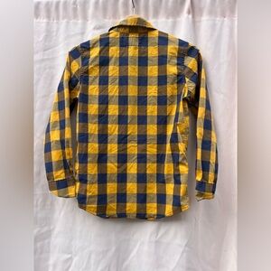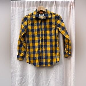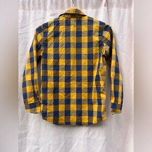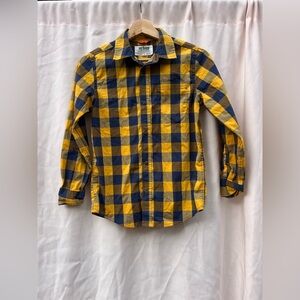 Casual button-down with a navy and mustard checkered design. Ideal for relaxed outings.