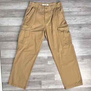 Classic utility cargo pants in a durable tan cotton. Features double flap back pockets, side cargo pockets, and relaxed straight leg fit. Size 32x32. Great for workwear, streetwear, or skater looks.