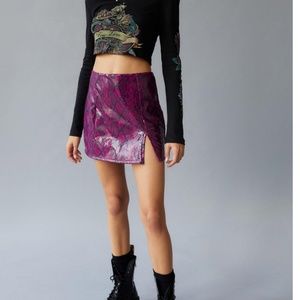 Throwback Y2K style mini skirt by Urban Renewal crafted using recycled materials. Faux leather fabrication with an allover snakeskin pattern. High-rise skirt with a zip closure at the back and finished with a notched above-the-knee hem.