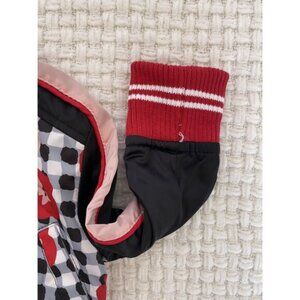 Bomber jacket in floral gingham print in black, white, pink, and red. It's well made and so cute! Size 12 months, I think it runs on the smaller side. Worn twice.