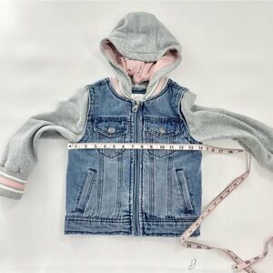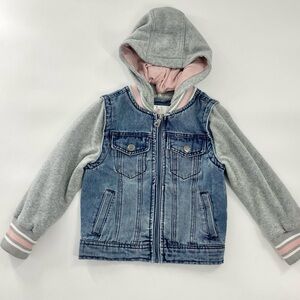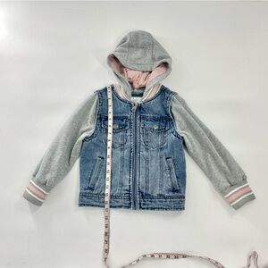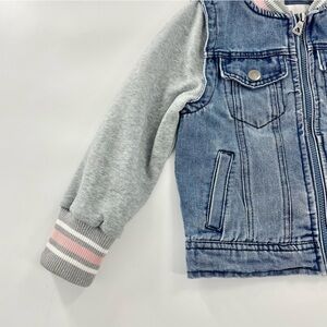 Urban Republic Medium Blue Wash Hoodie Hooded Denim Bomber Jacket Size Small 4. Has removable hood and light weight sweatshirt type sleeves and hood. In never worn condition.