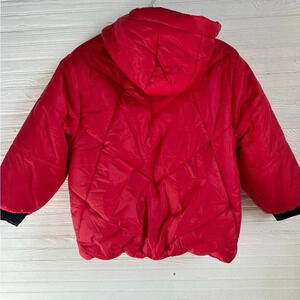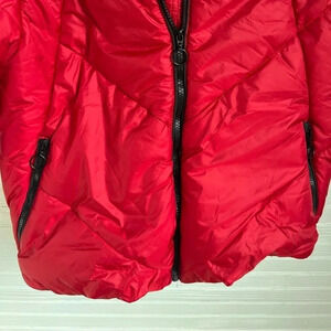 Features: Allover red puffer coat. Black cuffs, zippers and interior. Fleece lining. Ribbed cuffs.