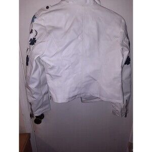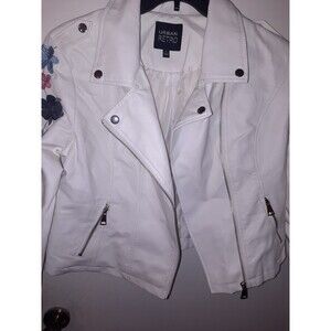 Urban Retro White Faux Leather Jacket – Women’s L– Floral Embroidered Moto Style