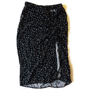 Black polka dot midi skirt with a ruched side and side split-thigh skirt makes the skirt flattering and versatile