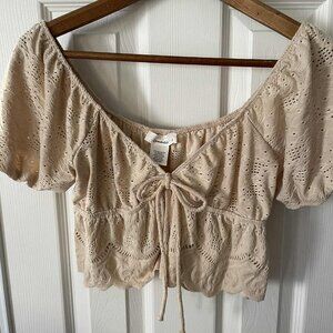 Juniors Urban Romantics Crop-Top size small gathered top w/tie open -belly style!! Great used condition/ beige color Polyester