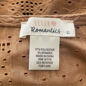 NWT Urban Romantics Eyelet Crop Top. Features a deep v-neckline, short sleeves, & a pretty allover eyelet design in a tan hue. Pullover style. Size large. Approximate measurements lying flat: 16” from pit to pit unstretched (stretches nicely to 19”) & 16” from shoulder to hem. Bundle to maximize shipping!
