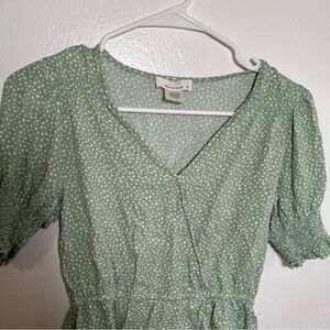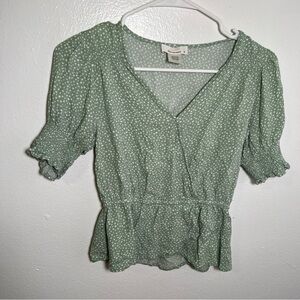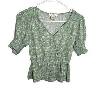 Great condition. Urban Romantics. Peplum top. Faux wrap, v-neck. Light green with white geometric dot pattern. Short, smocked sleeves. Size small. 100% rayon. Pit to pit laying flat 16” shoulder to hem 19” Sleeve (pit to hem) 5”. All measurements are approximate and taken lying flat. Smoke free home. No trades, offers welcome.