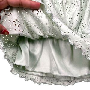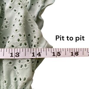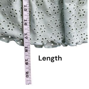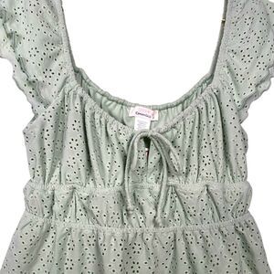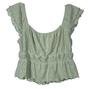 This is a women's boho chic blue eyelet blouse in size L from Urban Romantics Surf Gypsy. The blouse is designed with a hippie theme, made of rayon fabric, and comes in a regular size fit. The color of the blouse is green.
