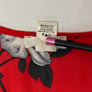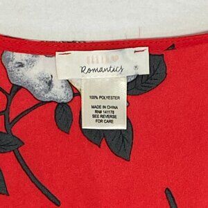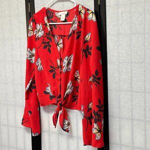 Tie Front Bell Sleeve Sheer Button Up Top from Urban Romantics. Lovingly worn - looks like new. Lightweight relaxed fit top with surplus ties at front waist. Sheer red background with grey and black floral design. V neckline and looped ball buttons down front. Flared long sleeves are open at wrists. Blouse lightly gathered to yoke in back. Back hem is curved and slightly longer than front. Hits just below waist. Lightweight sheer fabric makes it ideal for wearing solo or layering for a bold statement look.