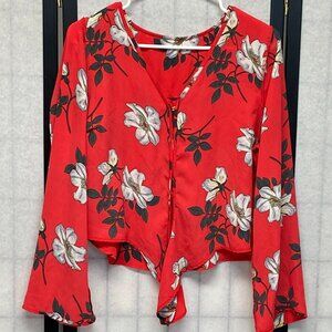 Urban Romantics V Neck Sheer Front Button Crop Tie Waist Bell Sleeve Top Red M
