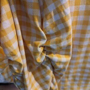 Introducing the Urban Rose Yellow/White Checkered Ruffle Bardot Blouse in Size 3X. This charming blouse combines the freshness of yellow and white checkered pattern with a trendy Bardot neckline and playful ruffle detailing. Elevate your style with this chic and comfortable piece from Urban Rose, perfect for a touch of casual flair in a size 3X.