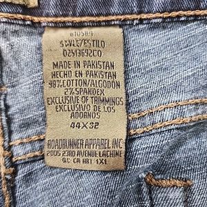 Urban Star men's jeans in dark blue denim. The straight leg design features stitch pockets and a zip closure, with a high rise for added comfort. 5-pocket design with a waist size of 44 inches and inseam of 30 inches. Crafted from a comfortable cotton blend fabric