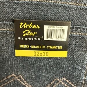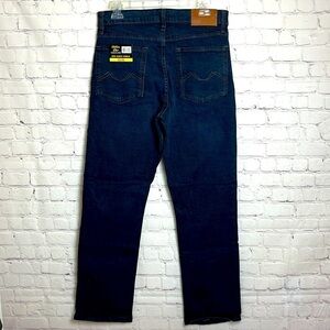 Dark wash. Button with zipper closure. Traditional 5 pocket design. 98% cotton/2% spandex. Relaxed fit. Straight leg