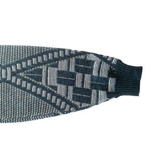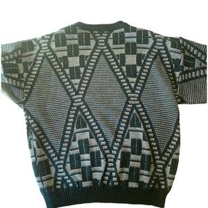 Great 90's vintage sweater in a geometric pattern. 100% acrylic with genuine leather trim on front. In really nice condition with no holes or stains. No pilling. Clean and from smoke free, pet free home. Machine washable. Ships next business day.