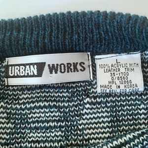 Urban Works Vintage Men’s Grandpa Sweater Real Leather Trim Teal/White Sz L