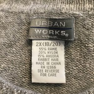 Urban Works Angora Rabbit Hair Glass beaded grey sweater size 2X ( 18/20 ), feels very soft and comfy perfect for the season. It’s a button up sweater.