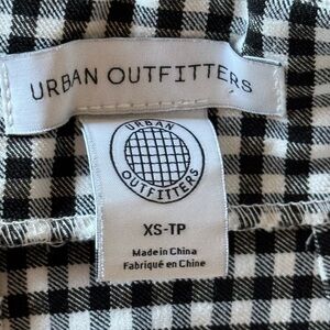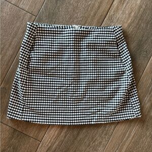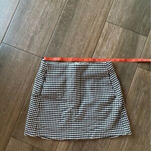 This Urban Outfitters skirt is a size XS in black gingham plaid pattern. It features a zipper closure, made of polyester, spandex, and rayon knit fabric with a mini length. The style is 90s-inspired and preppy, suitable for travel, casual outings, or workwear. It has pockets and is accented with a zipper.