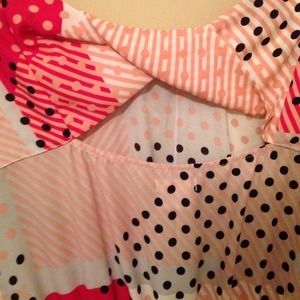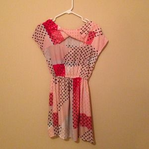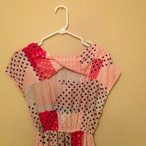 This is a cute patchy mixed pink print dress with polka dots. It has an open back twisted now in back. The waist is elastic. XS