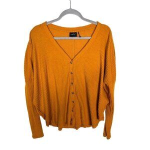 This Urban Outfitters Out From Under button-up thermal top is a must-have for any fashion-forward woman. Made with a blend of polyester, spandex, and rayon, this top is both comfortable and stylish. The solid yellow color and v-neckline add a touch of sophistication to any outfit, while the long sleeves and thermal features make it perfect for cooler seasons.
