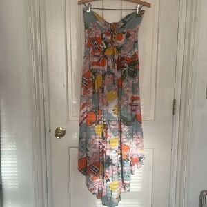 Embrace elegance with this strapless floral print dress. Perfect for any occasion, its vibrant colors add a touch of sophistication.
