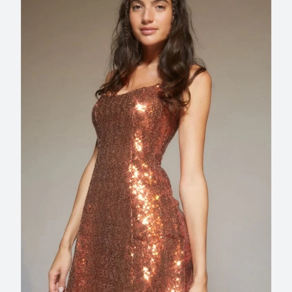URBAN OUTFITTERS! Size: xs Color: Bronze Shimmering sequin Slip dress Mini skirt Adjustable spaghetti straps 100% Polyester Machine wash