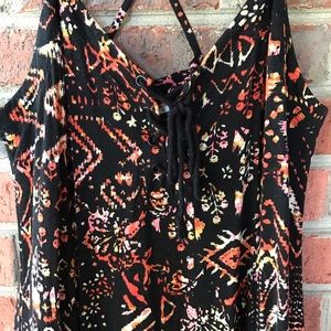 This sun dress is light and flowy. The color/pattern is great for any skin tone and pairs well with a jean jacket. It has a lace up front. Brand: silence + noise
