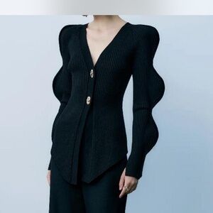 black knit cardigan, puffy sleeves, fitted top, sophisticated style, ribbed knit, slim fit, versatile layering, office wear, cozy sweater, bold shoulders
