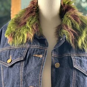 Used in almost new condition Urban Outfitters BDG Trucker Jacket w/faux fur. Oversized dark blue denim with a green and purple faux fur lining.