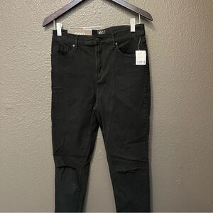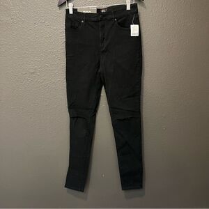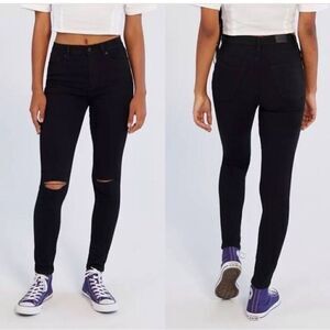 High-rise black jeans with slashed knees, exclusively for U by our staple collection BDG. In our skinny Twig fit in super-stretch denim for a skintight fit all day long. Finished with 5 pockets + a zipper fly. Super skinny 5-pocket jean from BDG in a new + improved lightweight, stretchy fit. Our skinniest fit; sits just above the hip. Fitted through the hip and thigh; super skinny leg. Added spandex for stretch and movement. Tapered through the super skinny leg in premium dyed denim, high-rise, zip fly. UO Exclsuive.