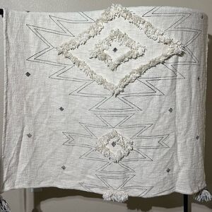 Soft cream throw with geometric patterns. Features textured diamond designs. Perfect for cozy decor.
