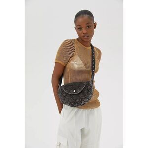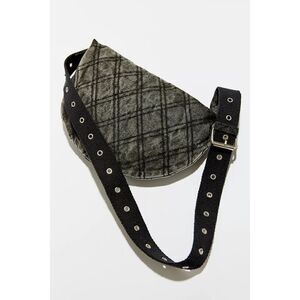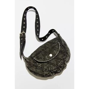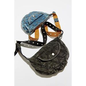 Half-moon zip pouch designed in washed, quilted denim with an exterior snap pocket and a grommet web belt you can wear across or on the body.