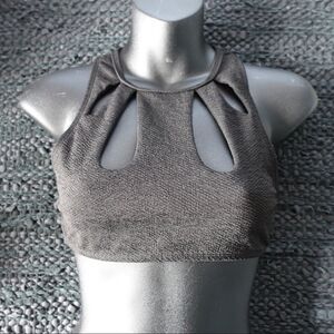 Sporty silhouette with sexy details in this high neck bikini top by Motel, available exclusively at UO. In a textured fabric with cutouts at chest + racerback for a classically cool look. Moderate coverage; lined.