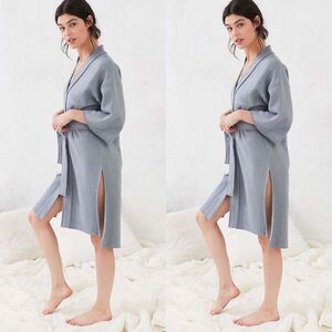 Slip on this buttery soft robe on those cold mornings and you'll be ready to start the day. Features wide 3/4 length sleeves, unfinished hem, a brushed ribbed lining, and sexy side slits.