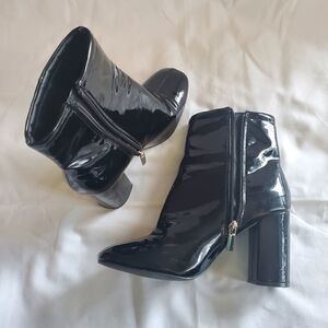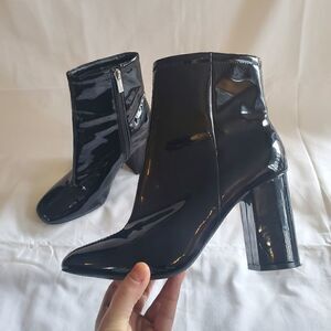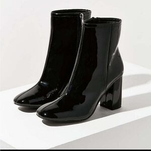 Urban Outfitters. Black. Shiny Patent Look. Side Zip Closures. Chunky Heel. Above the ankle shaft. Size 8. GUC.