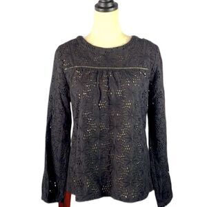 Black, crew neck top with floral print throughout the top, and eyelet cut outs throughout as well. Long sleeves with buttons on the shoulder, as well as the bottom of each sleeve. Excellent condition.