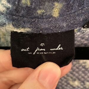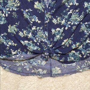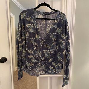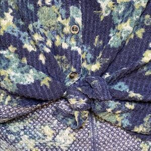 M tie front henley from Urban Outfitters, button down front to where it’s tied, sleeves are tighter but stretchy and body is flowy/oversized, v neck, blue/green/yellow flowered patter