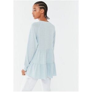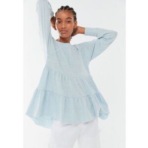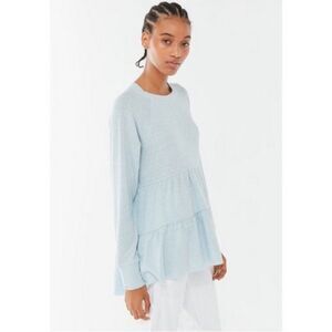 Tiered ruffle babydoll top from Urban Outfitters built from a soft knit in a crew neck silhouette. Topped with a raglan-style long sleeves and a relaxed fit down to peplum inspired hem.