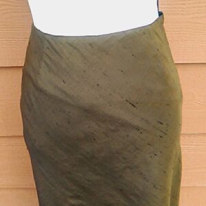 Made in the USA. Pretty silk skirt, brownish bronze with darker slubs. Net lining. Side zip. Size 1 measures 27 at waist, 36 at hips. 29 long from waistband to hem. Ruffly bottom. Super cute and classic.