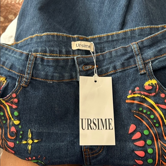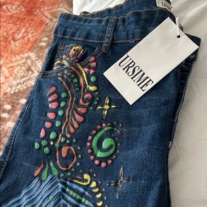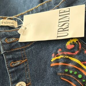 Ursime Women's Blue Jeans with Colorful Embroidery and Ankle Fraying NWT