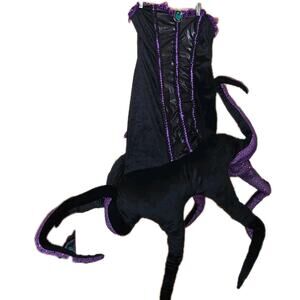 Dress - Black faux-corset strapless dress with a shiny front panel and purple pleated ribbon trim. There is an emerald-green jewel at the neckline. The bottom of the dress has bendable stuffed tentacles, with sequin purple fabric on the under-side. There are detachable clear plastic straps