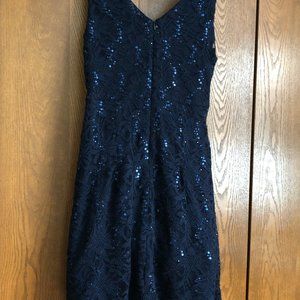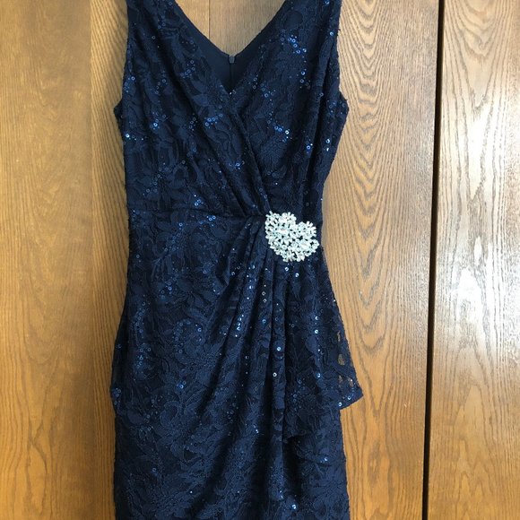 navy blue v-neck and v back with navy sequins and decorative rhinestone pin/brooch