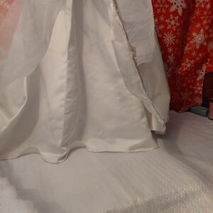 Elegant white lace dress. Features floral waist detail. Perfect for formal occasions. Sz 7.