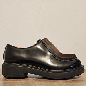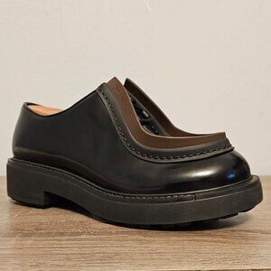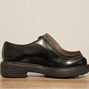 Prada continues to lead the pack in footwear with this cool ass shoe! brown trim highlights a shiny black leather shoe chunky and amazing box bags included
