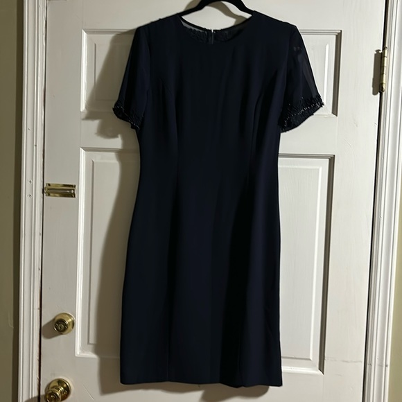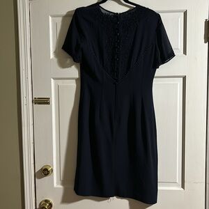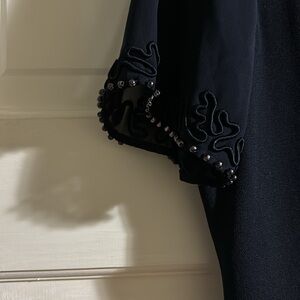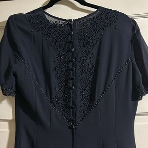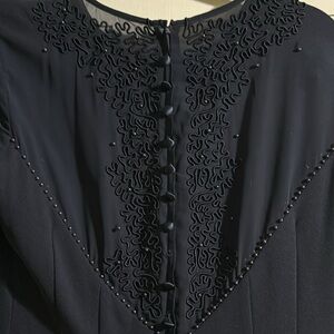 Beautiful details on the back and sleeves. Has a back zipper and buttons. One button is missing and other needs tighten. Slip in the back.